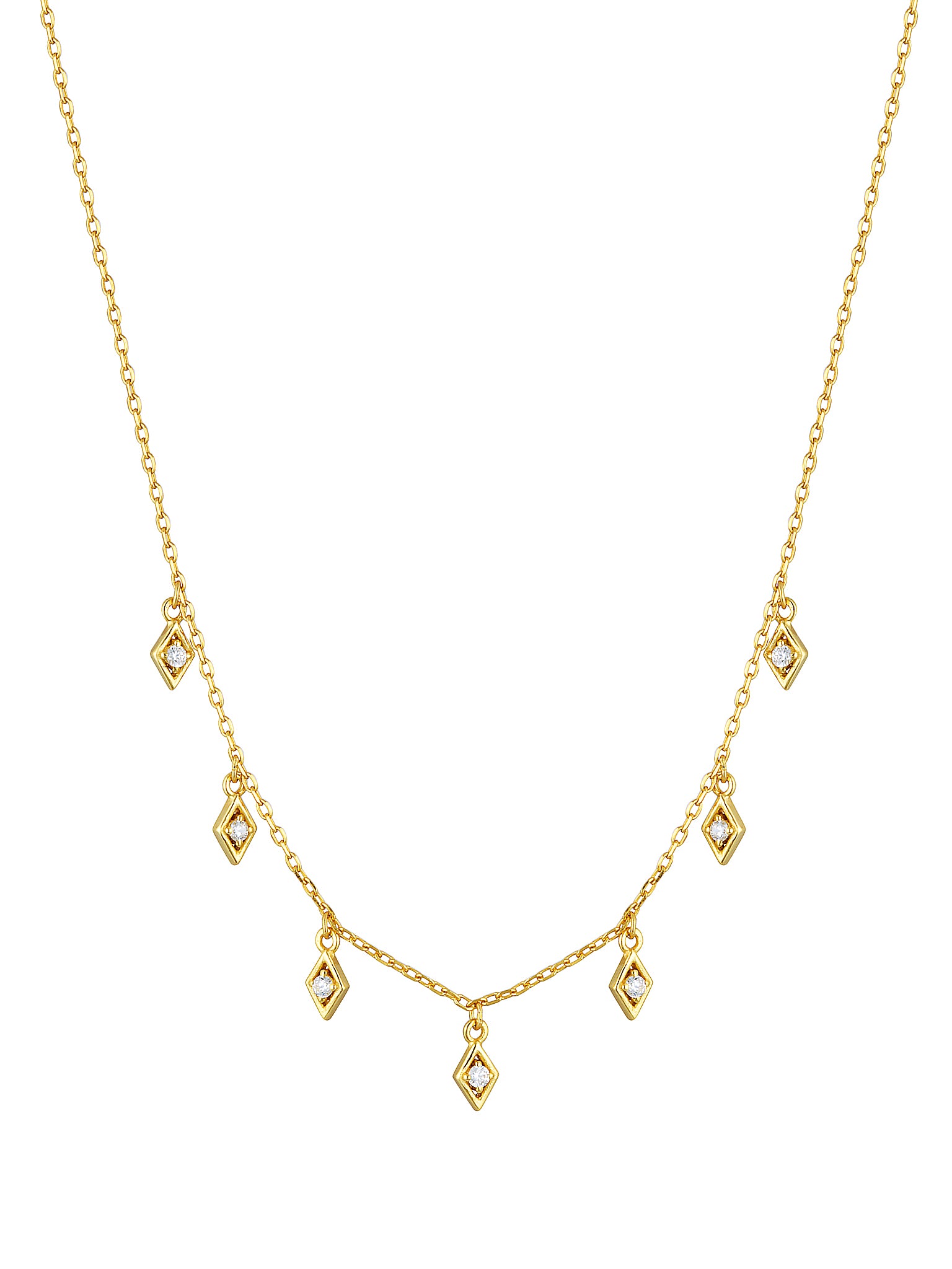 Complimenting our Willow Pendant Hoop is our Willow Necklace. Graceful and delicate it features seven diamond shaped pendants floating whimsically along your chest.