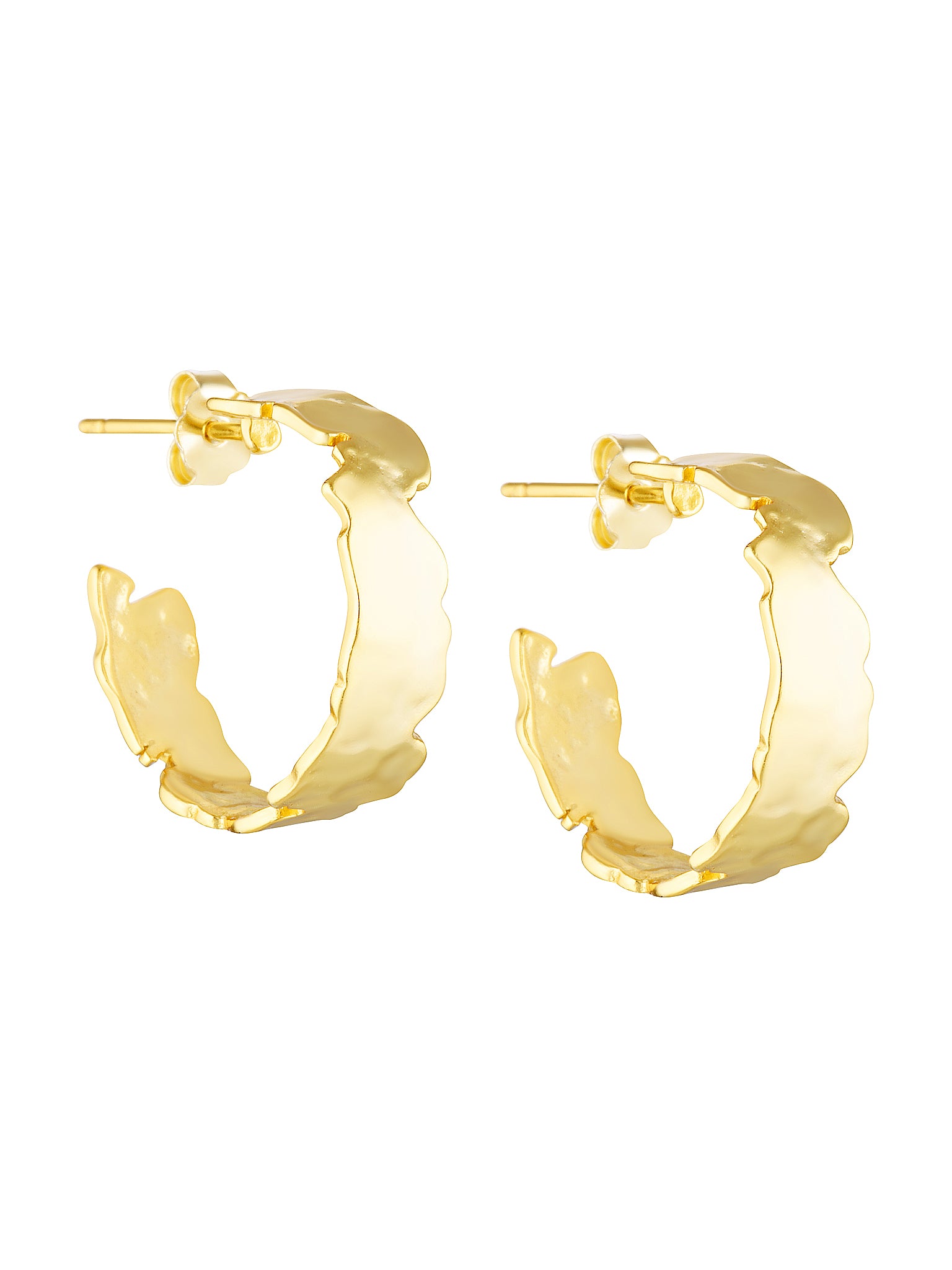 Soft jagged edges enhances the beauty of our timeless Stream Hoop. A thick 18k gold plated hoop with a post back, an earring that will complement your collection.